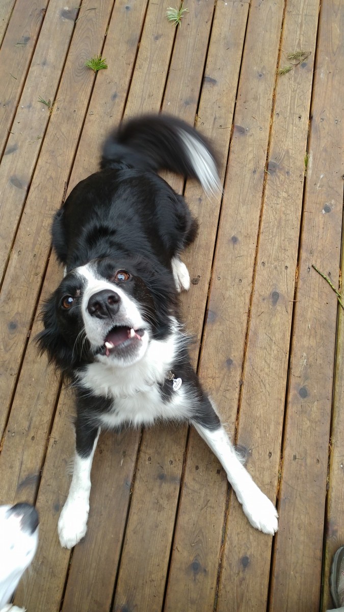 Then, Rhys pulled something similar with me. I really didn’t want a wiggly 35-pound behemoth on top of my chest as I was trying to chill and watch TV, the first time in weeks it felt like. He turned his head to my face, looked at me with an expression that was at the same time sweet, but also inscrutable, and pressed his paws around my neck. Before I knew it, I was laying down on the couch, with an adolescent border collie spread across me and softly vibrating with his soft snore. I have no idea what was on TV. All I knew was that I was smiling and gazing down on the sleek head of an adolescent border collie that had magically lulled my spinning and overactive mind.